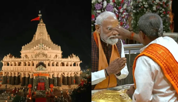 सोमनाथ / नई दिल्ली। प्रधानमंत्री नरेंद्र मोदी गुजरात दौरे पर हैं। उन्होंने सोमनाथ मंदिर में देवाधिदेव महादेव के प्रथम ज्योतिर्लिंग के दर्शन-पूजन किए। इससे पहले सोमनाथ स्वाभिमान पर्व में शामिल होने के लिए सौराष्ट्र आगमन पर प्रधानमंत्री का गर्मजोशी से स्वागत किया गया। सोमनाथ मंदिर में इस अवसर को खास बनाने के लिए कई विशेष आयोजन किए गए हैं। पीएम मोदी भी इसके साक्षी बने। सोमनाथ स्वाभिमान पर्व में शामिल होने गुजरात पहुंचे प्रधानमंत्री का आज गर्मजोशी से स्वागत किया गया। सड़क मार्ग से मंदिर तक पहुंचे पीएम मोदी के स्वागत में स्थानीय लोग और पार्टी कार्यकर्ता बड़ी संख्या में घरों से बाहर निकले।बता दें कि देश के द्वादश ज्योतिर्लिंगों में सबसे पहले सोमनाथ महादेव का उल्लेख किया जाता है। इसकी स्थापना के 1000 साल पूरे होने के अवसर पर सरकार और मंदिर के ट्रस्ट की तरफ से सोमनाथ स्वाभिमान पर्व का आयोजन किया गया है। इसके तहत कई धार्मिक, आध्यात्मिक और सांस्कृतिक कार्यक्रम कराए जा रहे हैं। पीएम मोदी सोमनाथ में आयोजित ड्रोन शो के भी साक्षी बने।