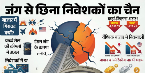 पश्चिम एशिया में ईरान-इस्राइल-अमेरिका युद्ध के कारण कच्चे तेल की सप्लाई बाधित होने का भारी डर पैदा हो गया है। इस दहशत के कारण सोमवार को सेंसेक्स 2,400 अंकों का गोता लगा गया, जबकि निफ्टी करीब 3% टूटकर 24,028.05 के स्तर पर आ गया। भू-राजनीतिक अनिश्चितता के बीच विदेशी पोर्टफोलियो निवेशक (एफपीआई) तेजी से अपना पैसा निकालकर सुरक्षित विकल्पों (जैसे डॉलर) का रुख कर रहे हैं। इससे बाजार में बिकवाली की सुनामी आ गई है। हालांकि, बाजार बंद होते समय सेंसेक्स और निफ्टी अपने निचले स्तरों से संभलकर बंद हुए।