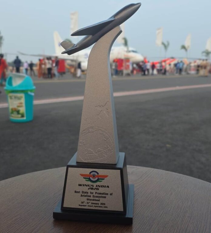 देहरादून: हैदराबाद स्थित बेगमपेट एयरपोर्ट में 29–31 जनवरी 2026 को आयोजित देश के प्रतिष्ठित एविएशन इवेंट “WINGS INDIA 2026” में उत्तराखंड राज्य को “Best State for Promotion of Aviation & Ecosystem” के प्रतिष्ठित राष्ट्रीय सम्मान से नवाजा गया। यह सम्मान मुख्यमंत्री पुष्कर सिंह धामी के दूरदर्शी नेतृत्व और राज्य सरकार की प्रभावी एविएशन नीतियों का परिणाम है। यह सम्मान केंद्रीय नागरिक उड्डयन मंत्री द्वारा प्रदान किया गया। इस अवसर पर सचिव सचिन कुर्वे, अपर सचिव आशीष चौहान एवं संजय टोलिया सहित अनेक गणमान्य उपस्थित रहे।