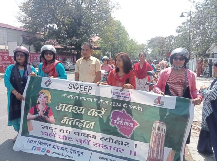 मुख्य विकास अधिकारी नोडल अधिकारी स्वीप झरना कमठान ने 30 मार्च 2024 से 06 अप्रैल 2024 तक बूथ जागरूकता सप्ताह कार्यक्रम के तहत्  आज प्रथम दिवस पर महिला मतदाताओं को जागरूक करने हेतु जनपद में विभिन्न स्थानों पर रंगोली एवं स्कूटी रेली का आयोजन किया गया। देहरादून शहर में महिला सशक्तिकरण एवं बाल विकास विभाग की स्कूटी रैली को मुख्य विकास अधिकारी ने फ्लैग ऑफ किया गया। उक्त रेली में लगभग 125 स्कूटी पर 180 महिलाओं द्वारा प्रतिभाग किया गया। उक्त रैली में स्कूटी मतदाता जागरूकता स्टीकर और महिलाओं द्वारा मतदान संबंधी नारों के साथ सर्वे चैक से प्रारंभ होकर बहल चैक से घंटाघर तदोपरांत ई सी रोड होते हुए आराघर पर समापन की गई। रैली मे आंगनबाड़ी कार्यकत्रियों द्वारा राह में चलते लोगों, स्ट्रट वेण्डर, फल विक्रताओं आदि को मतदाता जागरूकता पैम्फलेट भी वितरित किए गए।